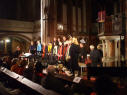 Dann rückt der ganze Chor an, voller Enthusiasmus, alle unterschiedlich schwarz gekleidet, die Frauen mit sehr bunten Schals - das Markenzeichen. Dahinter hell beleuchtet der weiße Jesus mit offenen Armen - überhaupt die ganze Kirche in vorweihnachtlichem Glanz.