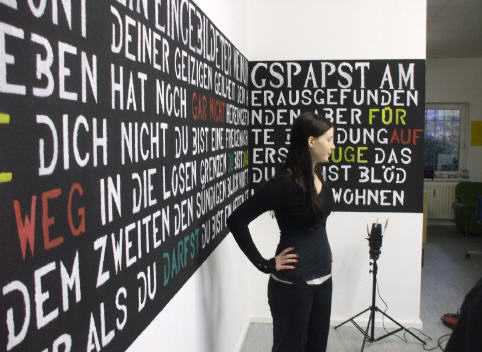Die letzte Ausstellung "verwirklichte realität"ist plakativ - Du-Botschaften an allen Wänden, aggressiv und aufdringlich, dazwischen ein zerbrechliches Ich.